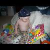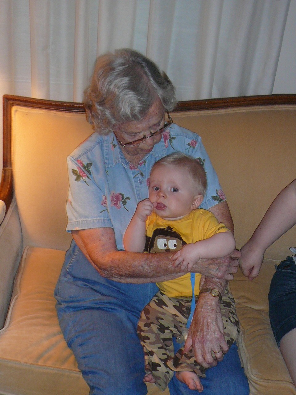 The next night, we went to visit his great grandmother (Bruce's mother Maud), Aunt Nancy, and Uncle Victor. Tommy was too tired to be excited by these new people, though he was happy to be thrown around by Uncle Victor and carried around by his Aunt Nancy. The day after that was spent exclusively with Bruce, Patricia, and their cats. Tommy was particularly fond of Tiger and his tail.