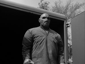 Then the plot takes a pretty wild left turn, as the scientists take the badly burned and unconscious body of the Gill-Man back to their boat, wrap him up in full-body bandages, and force him to breathe out of vestigal lungs he's apparently had the whole time. They discover that, as his outer scales slough off from his wounds, he has human skin underneath. Even his eyes become more man-like. Before long, he goes from the lithe and lean fish-man to a lumbering giant (in clothes, no less) that has more in common with Frankenstein's monster than the creature from the Black Lagoon.